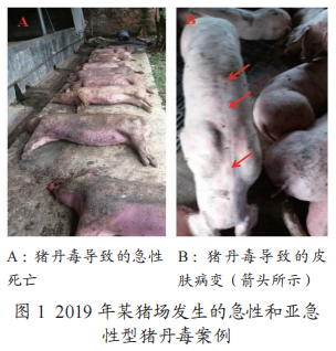發病豬只往往伴隨有四肢關節的疼痛,不愿站立,驅趕后表現憤怒,伴有尖叫,走路僵硬,如踩高蹺狀等癥狀。多數發病豬只會出現食欲下降,部分或完全廢絕,如果發病時剛好處于母豬的懷孕期則還可以出現流產、死胎增加等繁殖障礙問題。特征性的皮膚病變被稱為“大紅袍”、“小紅袍”、“打火印”、“鉆石樣皮膚病變”,可以作為初步診斷的依據(容易與慢性非洲豬瘟混淆),感染后的第2天皮膚病變就開始發生,到第3天仔細觀察時可以發現皮膚上出現小的、粉紅色和黑褐色丘疹塊,單塊皮膚病變一般呈方形或菱形(圖1B),注意杜洛克、皮特蘭等皮膚顏色較深的豬發病后需要通過觸診確定。皮膚病變的嚴重程度常常指示著發病的愈后,顏色越深愈后越差,粉紅到淺紫色皮膚病變對應急性非死亡發病;而黑紫色皮膚病變則暗示發病豬只即將死亡或以死亡終結。
