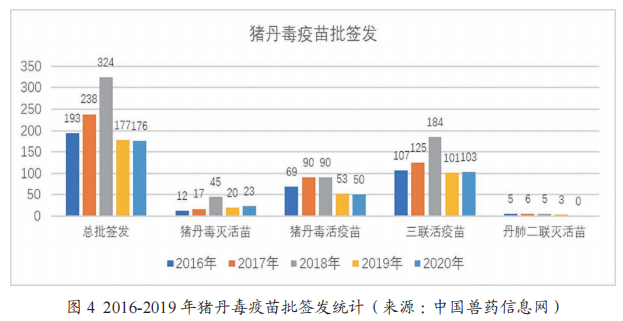 從收集整理的數據來看,國內商品化的豬丹毒疫苗品種有4種,豬丹毒滅活、豬丹毒活苗、豬丹毒-豬肺疫-豬瘟三聯活疫苗和豬丹毒-豬肺疫二聯滅活疫苗,疫苗的使用大大降低了豬丹毒病的發生率,特別是三聯活疫苗在一定時期給我國豬瘟-豬肺疫-豬丹毒的聯合防控發揮了非常重要的作用。截止2020年,共有21家生產企業獲得豬丹毒疫苗的生產批文,從2016-2020年批簽發數據可以看出,三聯活疫苗的使用量最大,其次為活疫苗單苗和滅活疫苗(圖4)。然而,一些學者認為豬瘟-豬肺疫-豬丹毒三聯疫苗,由于存在著3種不同病原成分,相比活疫苗單苗會存在更高的安全隱患特別是在母豬、個體弱、發病的豬免疫時可能會導致嚴重的副反應,其次隱性感染豬只接種弱毒疫苗時還有引起疾病暴發的風險。