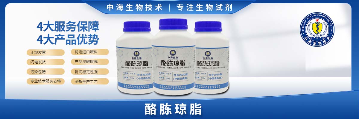 中海酪胨瓊脂培養基用于需氧菌的無菌檢驗,需氧菌是指具有較為完善的呼吸酶系統,需分子氧做受氫體,只能在有氧條件下生長繁殖的菌類。而酪胨瓊脂培養基(GA)含有胰酪蛋白胨、酵母浸出粉、L-半胱氨酸鹽酸鹽、葡萄糖、氯化鈉和瓊脂粉成分,在這些成分中胰酪蛋白胨又稱為胰酶消化酪蛋白胨,含有豐富的氮源和氨基酸等;酵母浸出粉是經自溶、酶解、濃縮、干燥等工藝制成的,富含蛋白質、B族維生素、生長因子以及微量元素等營養成分,葡萄糖是生物的主要供能物質;氯化鈉維持均衡的滲透壓;而瓊脂粉具有特殊的凝膠性質,可作為培養基的凝固劑使用。中海生物酪胨瓊脂培養基中的成分可以為需氧菌的生長提供營養成分,為需氧菌的無菌檢驗創造條件。
