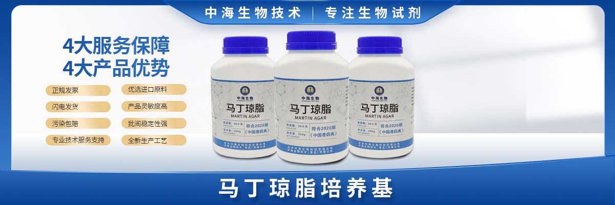 馬丁瓊脂培養基是固體培養基,主要用于多殺性巴氏桿菌和豬丹毒疫苗的培養及檢驗。此培養基是由蛋白胨、牛肉浸出粉、酵母浸出粉、氯化鈉、瓊脂粉組成。其中,蛋白胨能為微生物提供C源、N源、生長因子等營養物質;牛肉浸出粉主要作用是補充蛋白胨以及其它氮源的營養不足;酵母浸出粉含有豐富的B族維生素和各種氨基酸,可以為微生物補充氮源和提供細菌生長的各種維生素及氨基酸,以保證多殺性巴氏桿菌及豬丹毒疫苗培養所需的營養物質。因此,經棗莊中海生物技術馬丁瓊脂培養基培養出的細菌,菌落形態穩定,質量放心。