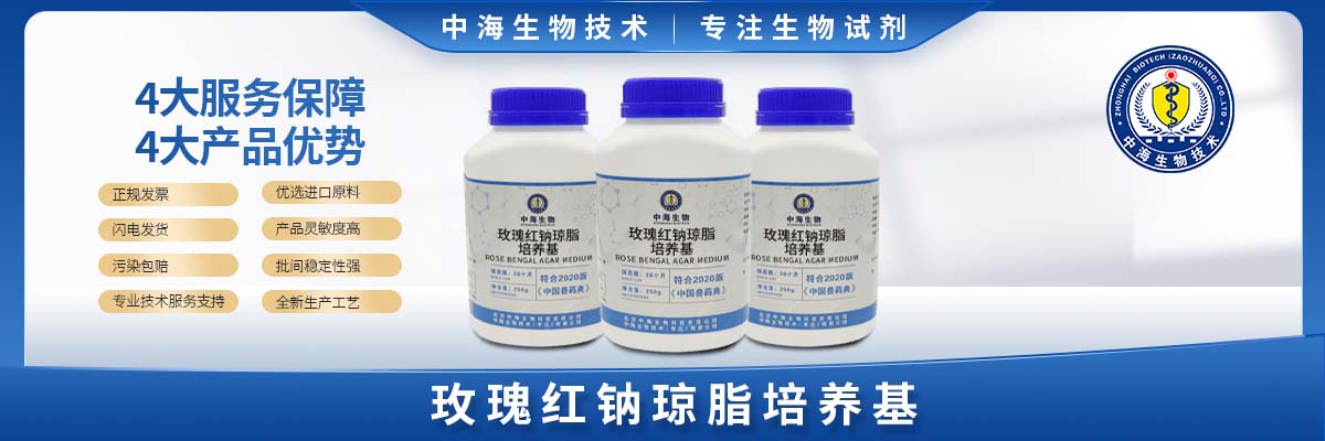 中海生物技術玫瑰紅鈉瓊脂培養基含有蛋白胨、葡萄糖、磷酸二氫鉀、硫酸鎂、玫瑰紅鈉和瓊脂粉成分,其原理是由蛋白胨在培養基中作為營養物質提供菌體生長所需的氮源和碳源;葡萄糖提供能源;磷酸二氫鉀為緩沖劑,起著緩沖培養環境pH值的作用;硫酸鎂提供必須的微量元素;玫瑰紅鈉是一種指示劑,具有一定抑菌作用的選擇性成分,所以作為選擇性抑菌劑可抑制細菌的生長,并可減緩某些霉菌因生長過快而導致菌落漫延生長。