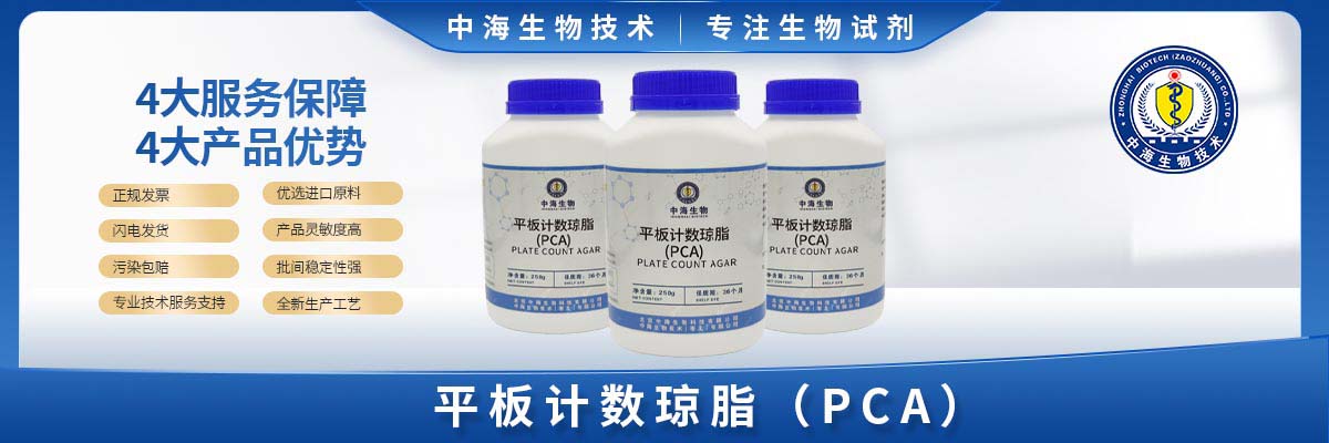 平板計數瓊脂培養基又簡稱為PCA,是用于菌落總數的測定,該培養基屬于非選擇性固體培養基,其主要成分包括胰蛋白胨、酵母浸粉、葡萄糖以及瓊脂。胰蛋白胨提供有機氮源和游離氨基酸,酵母浸粉含有營養成分豐富,可為微生物提供生長因子,葡萄糖作為能量物質。中海生物技術平板計數瓊脂培養基中的營養成分能夠滿足絕大多數的微生物生長。以此進行微生物的菌落總數測定。